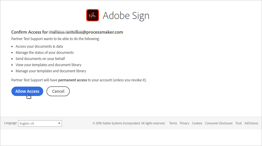 6. After entering the Adobe Sign Credentials, confirm access to your Adobe Sign account in the ProcessMaker server. Click Allow Access.