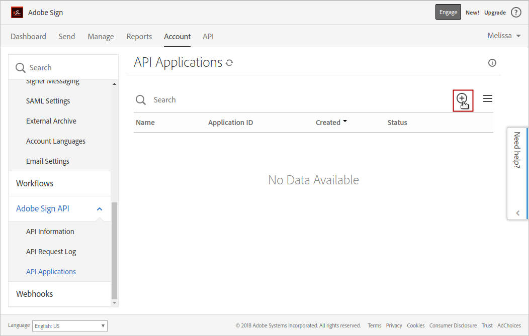 3. Go to Adobe Sign API > API Applications menu in the left side bar.