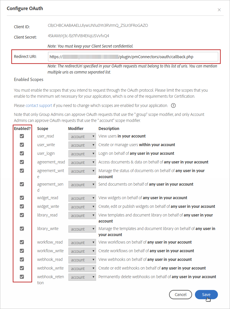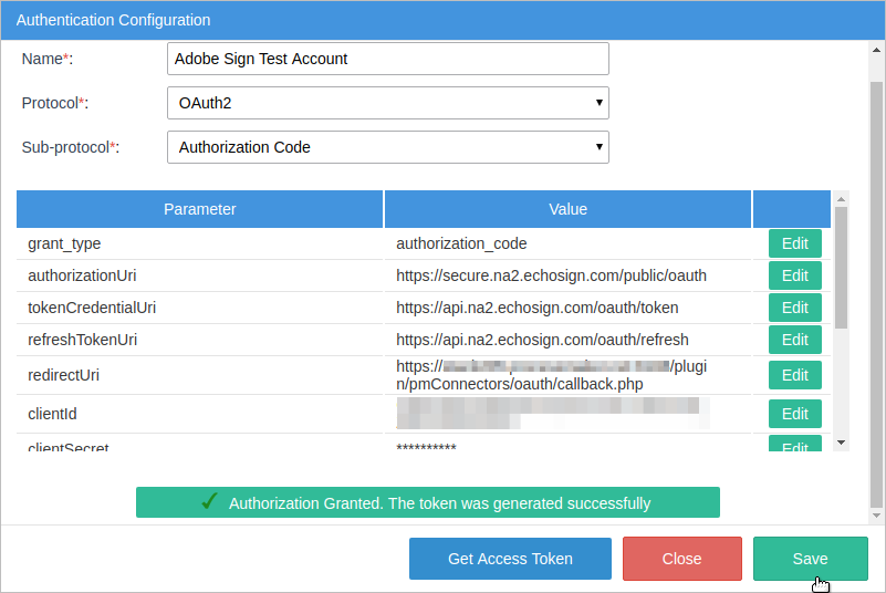 • Edit the following parameters. The blue words must be replaced by your customized values. grant_type: authorization_code authorizationUri: https://secure.na2.echosign.com/public/oauth tokenCredentialUri: https://api.na2.echosign.com/oauth/token refreshTokenUri: https://api.na2.echosign.com/oauth/refresh redirectUri: {SERVER_NAME}/plugin/pmConnectors/oauth/callback.php clientId: {CREATED APPLICATION ID} clientSecret: {CREATED CLIENT SECRET} scope: agreement_write agreement_read agreement_send library_read library_write response_type: code masterCredentials: true authorizationPrefix: headerAuthorization: Access-Token audience: