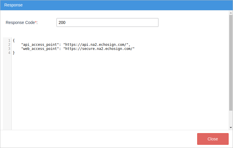 10. The Response screen with the 200 response displays if all previous configurations are correct. Click Close twice, one for this screen and the other for the Test Connector screen.