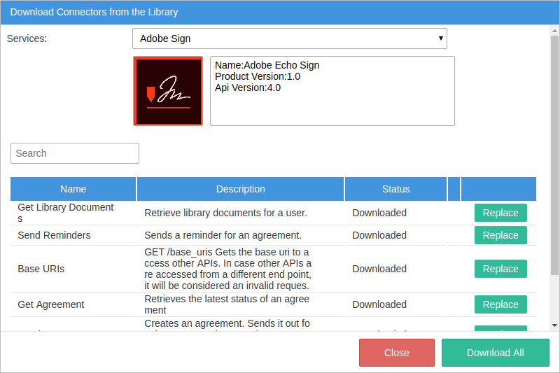 6. The connector status changes to Downloaded. Next to the Status column, the Replace button displays for each connector. Click Close.