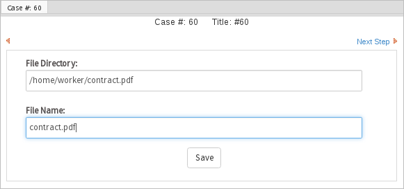 Open the case and the second Dynaform displays to fill in the path and name of the file that will be uploaded by the connector. In this example, the connector uploads a file named "contract.pdf" located in the /home/worker/ path.