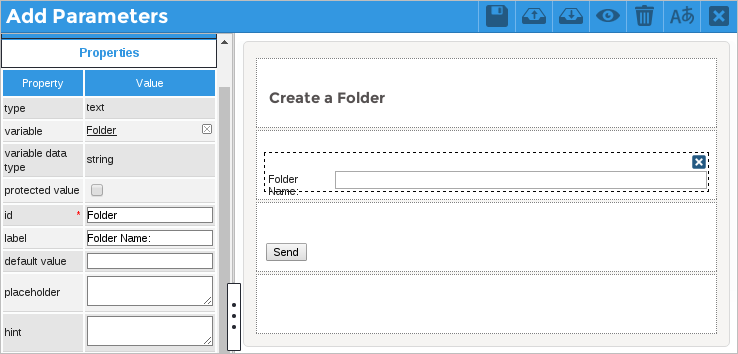 Create a Dynaform named "Add Parameters", where the user will define the name of the folder that will be created. This Dynaform contains a text control related to the folder variable, as shown in the image below.