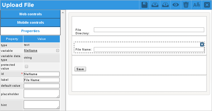 Create a second Dynaform named "Upload File", where the user will fill in the path and the name of the file that will be uploaded to the folder created. This Dynaform contains two text controls related to the filePath and fileName variables as shown in the image below.