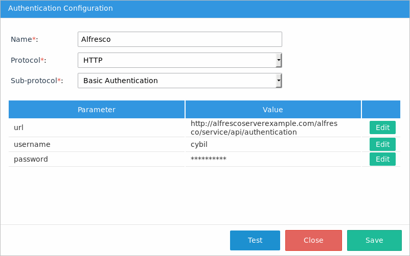 http://alfresco-server/alfresco/service/api/authentication path in the URL field.Click Save.