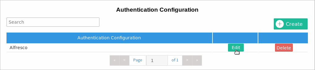 The Authentication Configuration screen displays. In the Alfresco row, click Edit to see and edit the authentication configuration details.