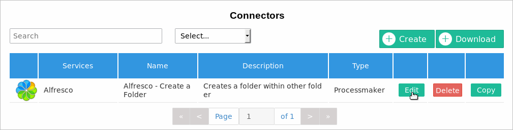For this example, we need to create a new connector named Alfresco - Upload a Folder, which will upload the file to the folder created. For this purpose in the Connectors screen in the top right, click Create.