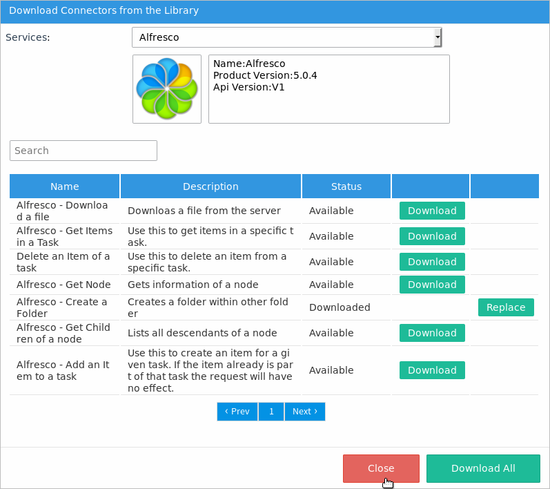 Note: If it is the first time an Alfresco connector is downloaded from the library into the workspace, after downloading all the connectors, the Alfresco authentication configuration, and the Alfresco service automatically download.