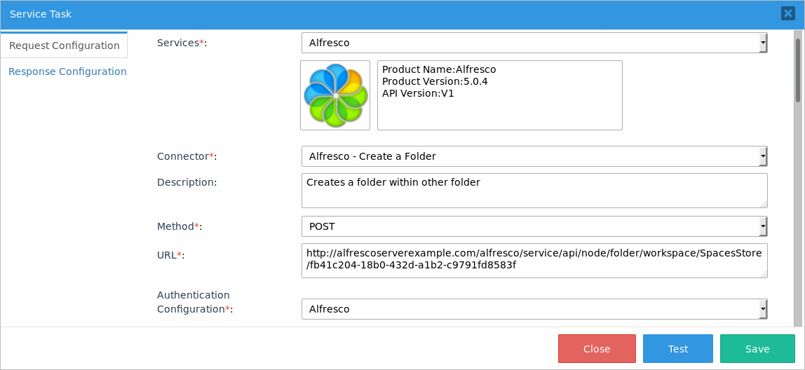 The "Create a Folder" task is a service task. Right-click it to edit its properties. In the Service Task window that opens, the Request Configuration tab displays. Select the Alfresco service and then select the Alfresco - Create a Folder connector. The Description, Method and URL fields fill in automatically with the connector's configuration. In the Authentication Configuration field, select the Alfresco authentication.