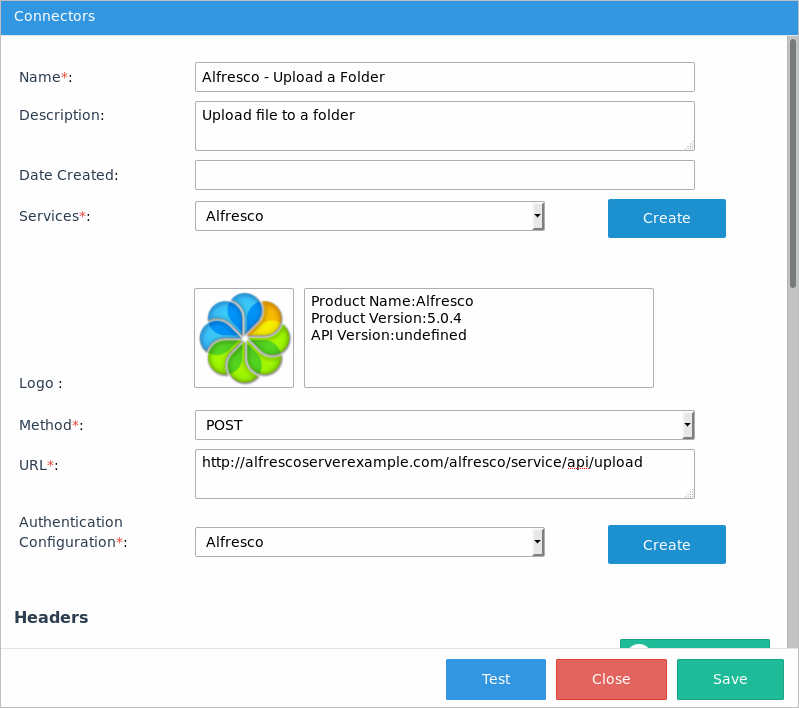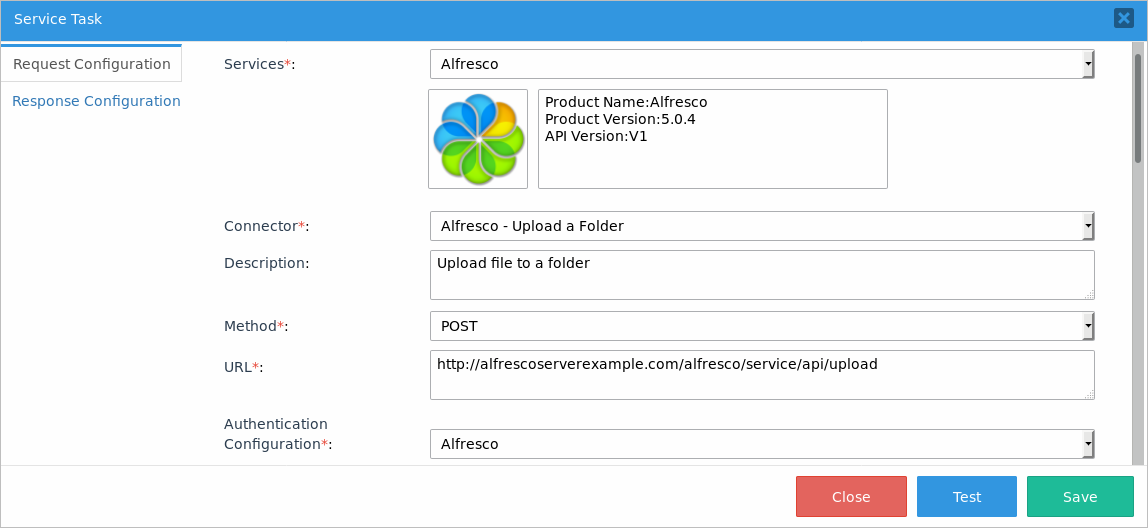 http://{alfresco-server}/alfresco/service/api/upload In this example, the URL is:http://alfrescoserverexample.com/alfresco/service/api/upload - In the Authentication Configuration field, select the Alfresco configuration.