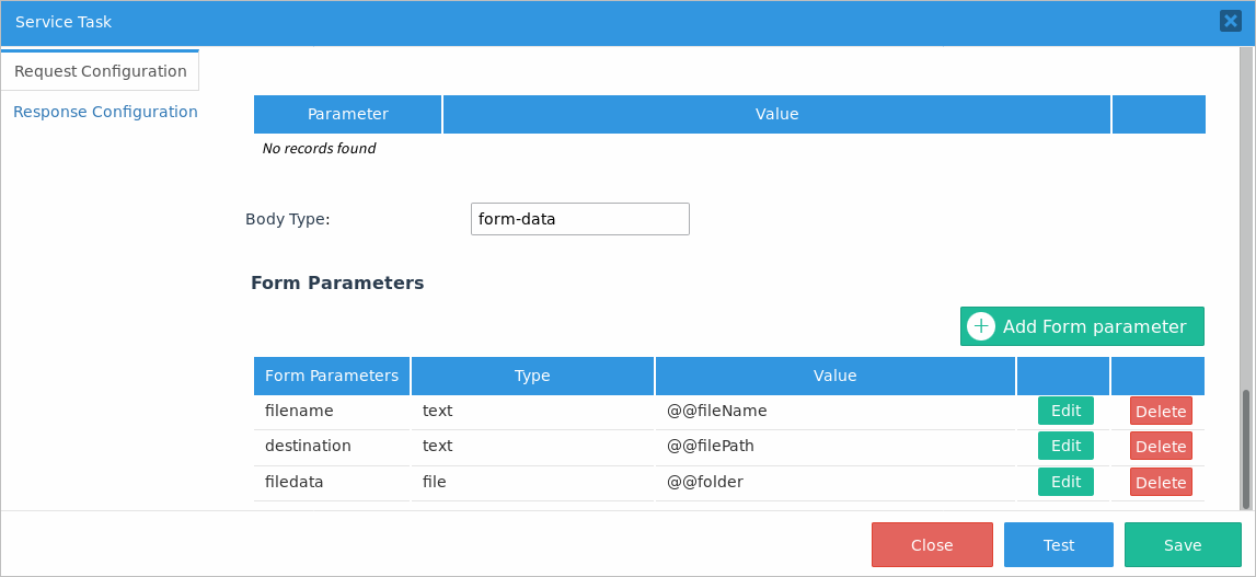 Form Parameter Type Value filename text @@fileName destination text @@filePath filedata file @@folder