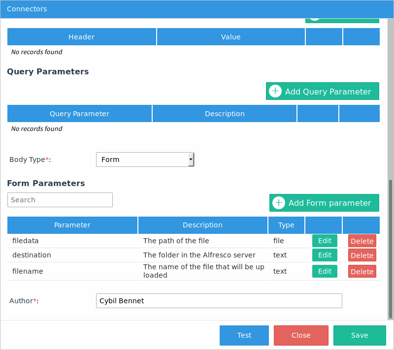 Parameter Description Type filedata The path of the file file destination The folder in the Alfresco server text filename The name of the file that will be uploaded text - In the Author field, enter the author name. In this example "Cybil Bennet".