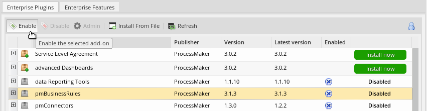 - To enable the Business Rules plugin, login with a user such as "admin" who has the PM_SETUPADVANCE permission in his/her role and then go to ADMIN > Plugins > Enterprise Manager. Either install the Business Rules plugin by clicking on