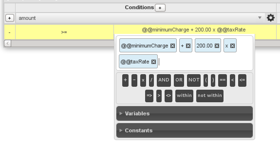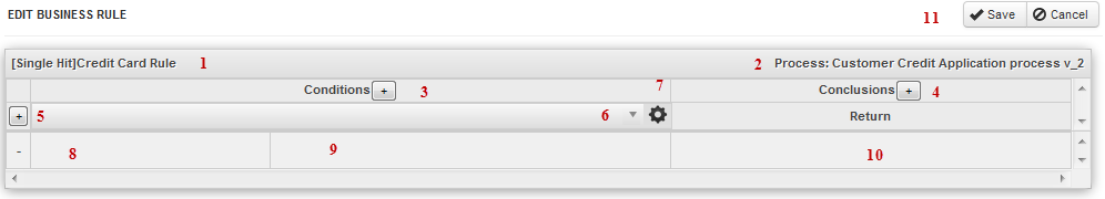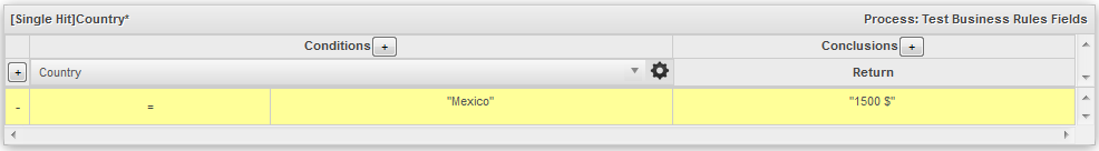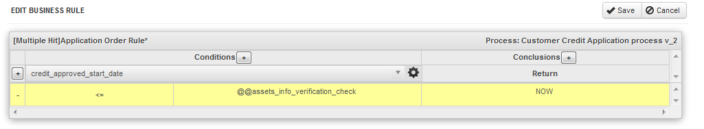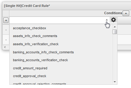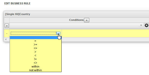 - Conditions: This section defines the conditions which will be evaluated. Click on the + button to add additional condition columns. See Defining conditions in a Business Rule Set below.