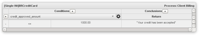 This example shows how to create a single-hit business rule set. This process uses a condition in a business rule set to evaluate whether a loan should approved or not: