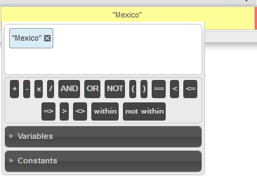- Value Compared: Enter a field, constant, literal value or a complex statement which will be compared to the value in the selected field. Click in the blank area to open the criteria builder, which can be used to select elements. See Defining conditions in a rule set.