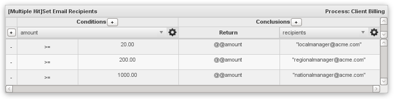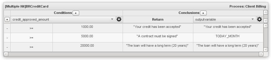 The same conditions are used, but different return values are set. In addition, a column was added in the Conclusions section to set an output variable for all the conditions which are true.