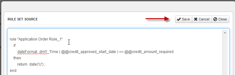 Once the rule set is created, its source code can be manually edited, which is often necessary if creating complex conditions which can't be created with the Criteria Builder. For example, the source code needs to be modified if needing to call a ProcessMaker or PHP function or if needing to join together several elements with the concatenate operator (.).