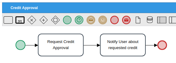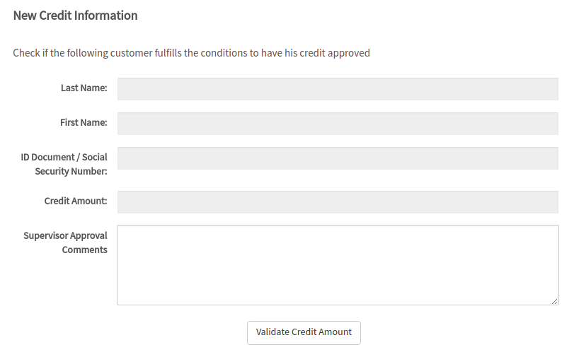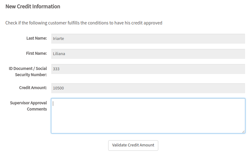Assign users to the tasks, and start a case. Enter the amount of 10500.00 in the Credit amount field. When the case is routed to the second task, it displays: