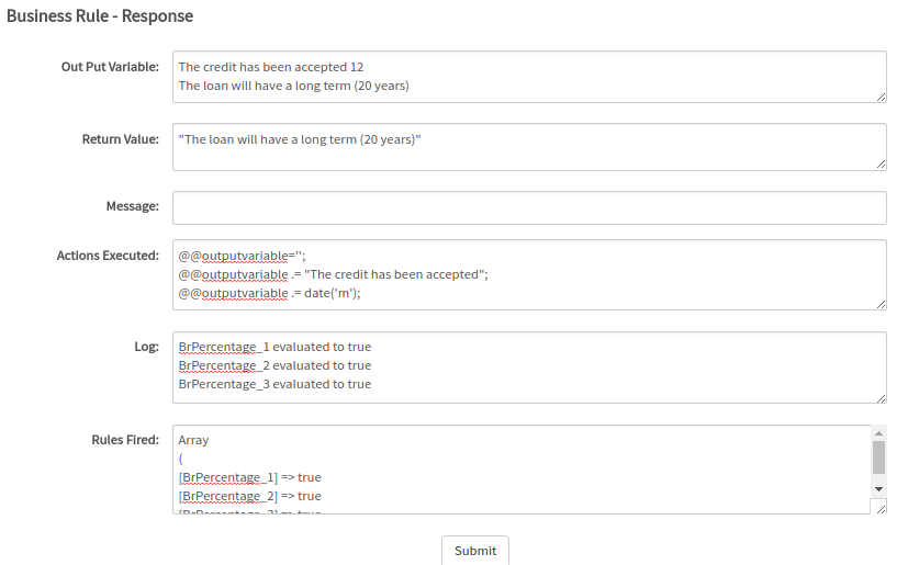- rulesFired It shows the result for each business rule, inside an array.