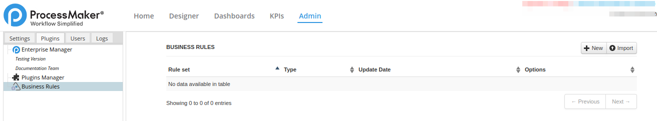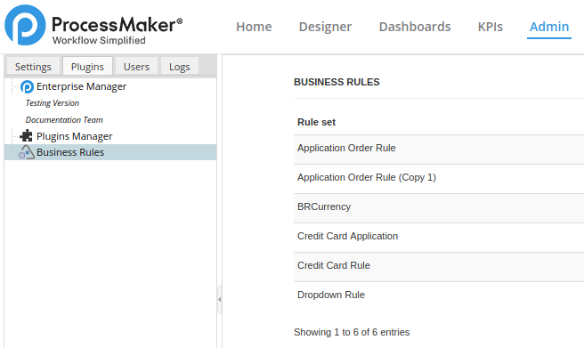 If using ProcessMaker 2.5, the Business Rules plugin will be available once the Enterprise Edition plugin has been imported and its license has been activated. If using ProcessMaker Enterprise Edition 2.8 or later, the Business Rules plugin is available by default.