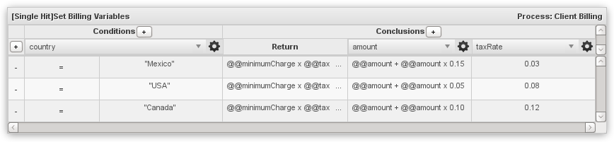 - Conclusions: This section shows the results which are returned if the condition evaluates to true. By default, a true condition only results in a return value. To also set the value of a case variable when a condition is true, click on the + button to add more conclusion columns.