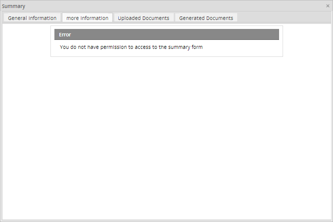If the user doesn't have the Summary Form permission and tries to access the More Information tab, the following message will be displayed: