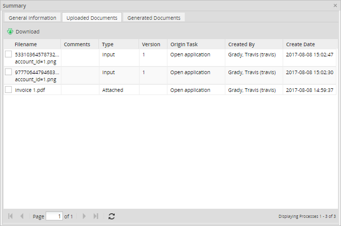 - Type: The type of the document, which can be "Input" if the document was attached to an input document, or "Attached" if the document was uploaded using a file or multiple file control.