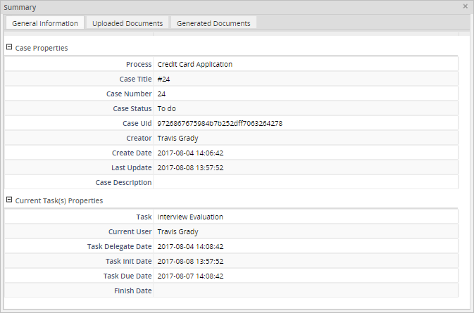 The General Information tab displays a brief description of the case that includes the case and current task(s) properties. Each one of these sections can be expanded or collapsed by clicking on the + and - buttons.