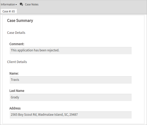 The Case Summary shows generic information about the state of a case, such as when the case was started, last updated and who is currently assigned to work on the case. In addition, the user can create a Dynaform that only displays pertinent information about the case and set this custom Dynaform to be shown instead of the general information when a user opens the case using the Jump to option or a case link