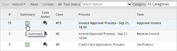 In ProcessMaker 3.2, the Dynaform selected in the Dynaform to show a Case Summary option was only displayed in cases with a TO DO status. As of ProcessMaker 3.2.1, this Dynaform will be displayed in cases with TO DO, DRAFT, PAUSED, CANCELLED, UNASSIGNED and COMPLETED status.