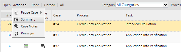 The Case Summary is shown when users click the Summary button in the Cases list or select the Summary option in the Actions menu when a case is selected. It is also shown to users who open a case to which they aren't assigned, but have been granted the process permissions to access a Case Summary tab.