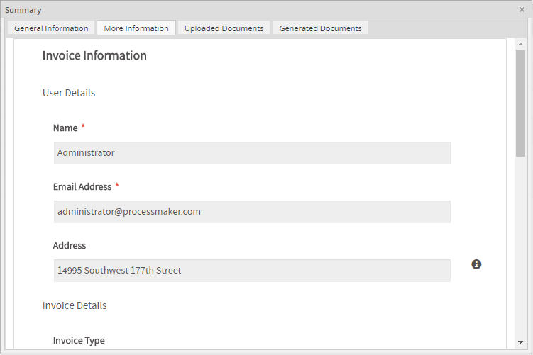 But if the configuration to show the More Information tab has been set, and a Dynaform has been selected in the Dynaform to show a Case Summary option in the configuration of the process, the selected Dynaform will be displayed instead of the general information.