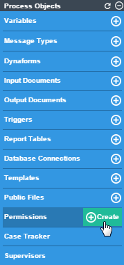 Assign the Summary Form permission to the user or group by hovering the pointer of the mouse over the (+) icon next to the Permissions option in the Process Objects menu, and clicking on the Create button.