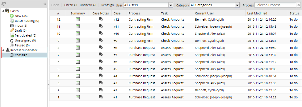 Note: These sub-menus list the processes where the user logged on has been a Supervisor in the process and is currently Reviewing or Reassigning the case.