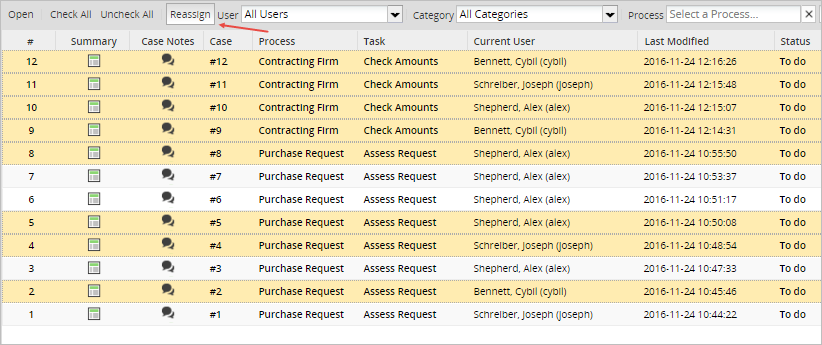 To reassign a case, select the case from the list and double click on the Reassigned to column. A list of users will be displayed where the search option is also available.