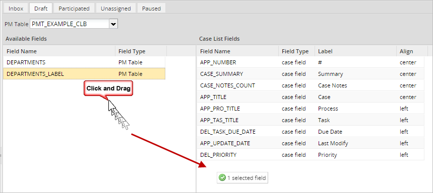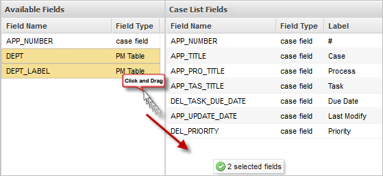 Select the DEPT_LABEL field and drag it to the Cases List Field panel on the right.