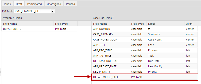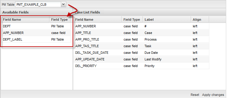 The fields in the PMT_EXAMPLE_CLB table will appear in the list of Available Fields.