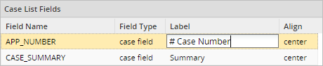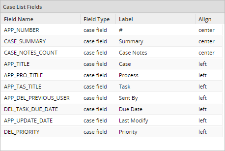 • Case List Fields: Displays the fields used as columns in the case list. The fields order can be changed by clicking on a field and dragging it up or down.