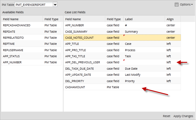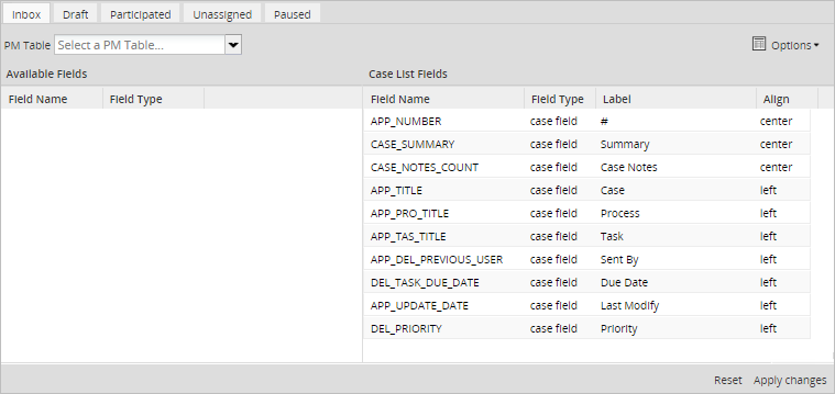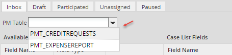 • PM Table: Select a report table to be queried for information to be displayed in the case list. Note that only tables that have an APP_UID field to hold the unique case ID will be displayed, because each record in the table has to be linked to a particular case.
