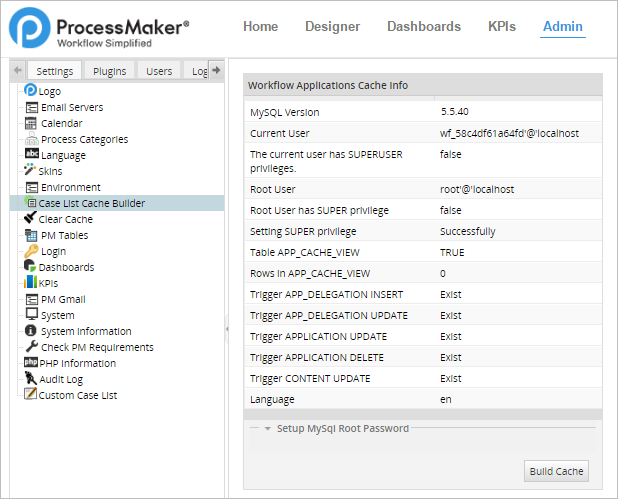Displaying lists of cases under the HOME menu can be slow when there are a large number of cases in the database, because ProcessMaker has query five different tables to display a list of cases. In order to speed up the display of case lists, ProcessMaker has added the wf_<workspace>.APP_CACHE_VIEW table to the database to contain all the information needed when querying case lists. In rare circumstances, the data contained in the wf_<workspace>.APP_CACHE_VIEW table can go out of sync with the information found in the APPLICATION, APP_DELEGATION, APP_THREAD, USERS and CONTENT tables. The Case List Case Builder can be used to rebuild the APP_CACHE_VIEW table from information found in these tables.