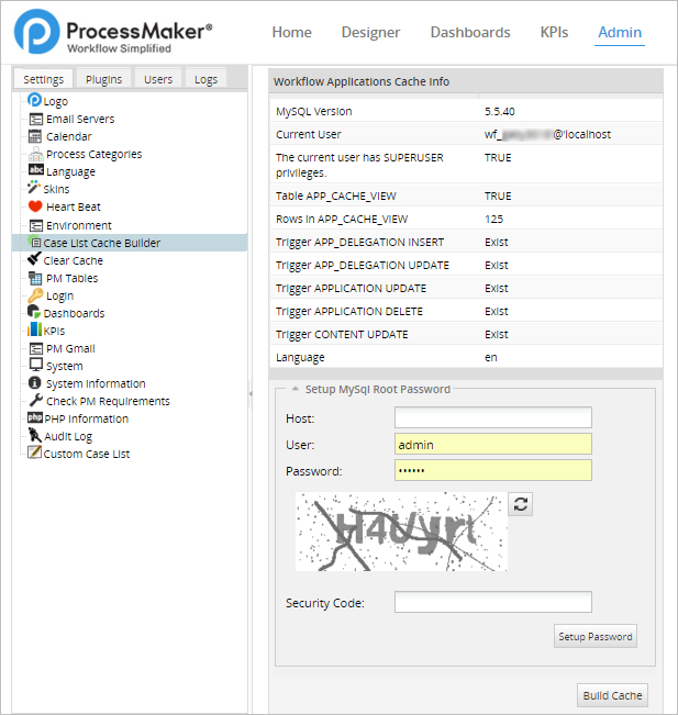The Case List Case Builder also provides an option to change the location of the MySQL database and its user, who is used to setup new workspaces in ProcessMaker.
