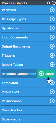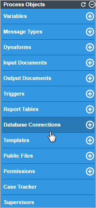To create a new database connection, open the project in which the connection will be used. Then go to right side of the screen and click on the + icon next to the Database Connections option in the Process Objects toolbox.