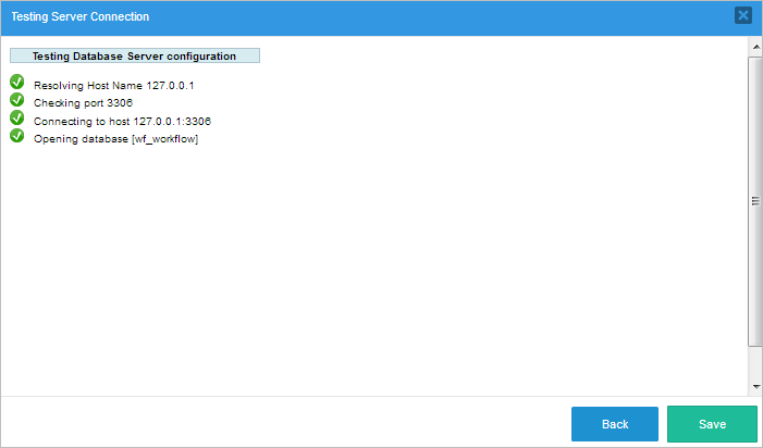 Click on Back to return to the previous window. To save the database connection, click on Save and it will be added to the list of existing database connections. A flash message will appear at the top of the window indicating that the connection was saved successfully.