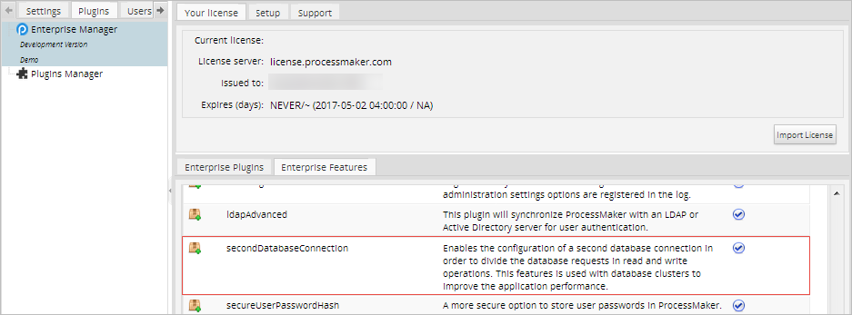 ProcessMaker Enterprise version 3.2 automatically includes the Double Connection feature after the Enterprise license is activated. To check whether the Double Connection feature is available, log into ProcessMaker as a user, such as "admin", with the PM_SETUP_ADVANCE permission in their role. Then, go to Admin > Plugins > Enterprise Manager and click on the Enterprise Features tab to see the list of available features.