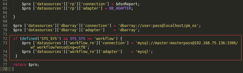 if (defined('SYS_SYS') && SYS_SYS == 'WORKSPACE-NAME') { $pro ['datasources']['workflow_ro']['connection'] = 'mysql://MYSQL-USER:PASSWORD@SLAVE-SERVER-ADDRESS:PORT/wf_workflow?encoding=utf8'; $pro ['datasources']['workflow_ro']['adapter'] = 'mysql'; $pro ['datasources']['rbac_ro']['connection'] = 'mysql://MYSQL-USER:PASSWORD@SLAVE-SERVER-ADDRESS:PORT/rb_workflow?encoding=utf8'; $pro ['datasources']['rbac_ro']['adapter'] = 'mysql'; } return $pro;