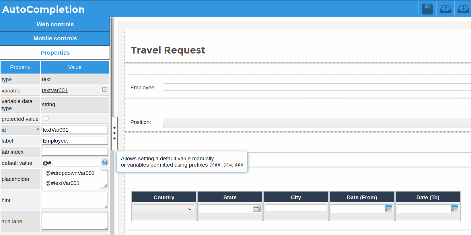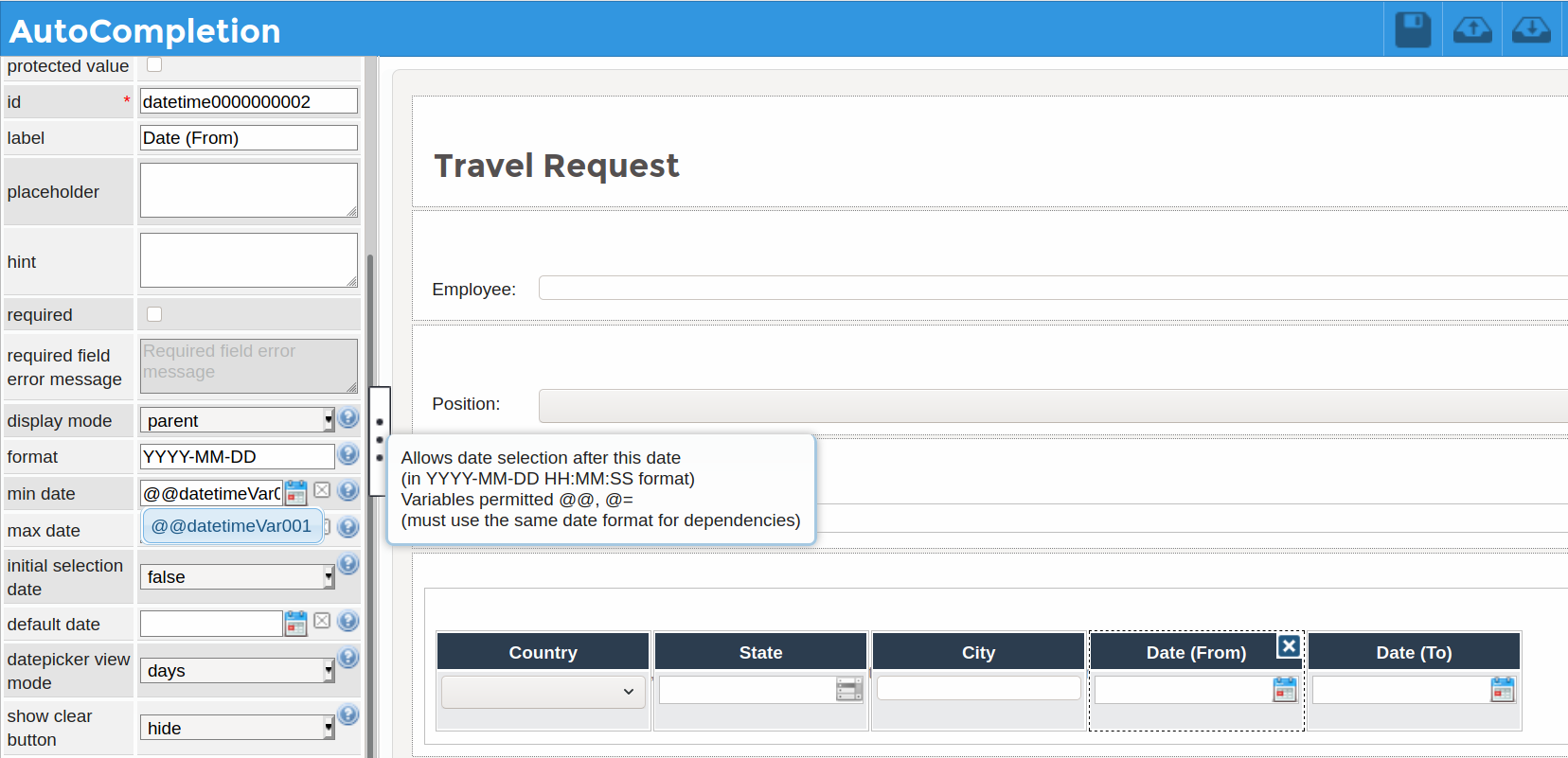 The default value, datetime, min date, max date, and default date control properties have an auto-completion functionality when adding variables: