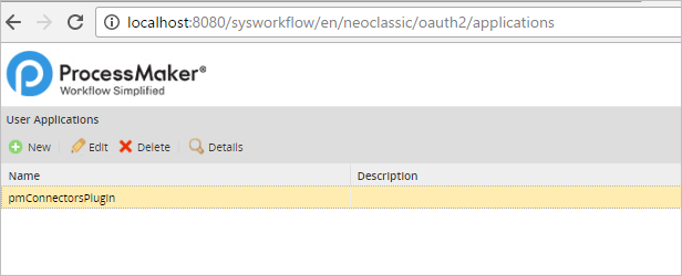 Before continuing, first it is necessary to register a user application to authorize access to ProcessMaker. By default, the pmConnectorsPlugin application is created when installing the Enterprise Connectors plugin. Therefore, go to http://ProcessMaker-server/sysworkspace/en/neoclassic/oauth2/applications to review the application created.