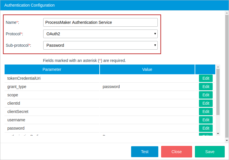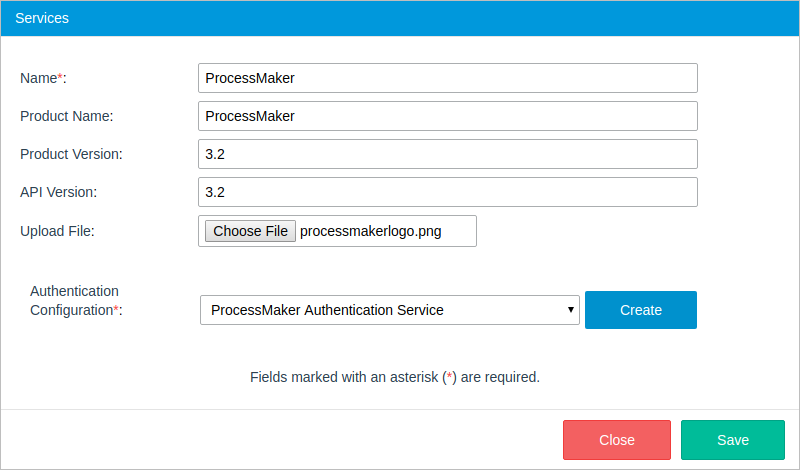 • Authentication Configuration: The configuration to which this service will belong. In this example the service selected is "ProcessMaker Authentication Service".