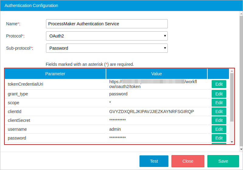 • tokenCredentialUri: OAuth2.0 authorizes the external application and logs into ProcessMaker in a single step by directly calling the /workspace/oauth2/token.